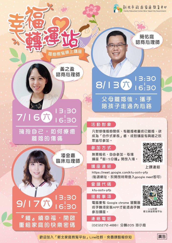 當婚姻走到盡頭,該怎麼成為友善父母? 發表於2022 年 6 月 21 日2022 年 8 月 20 日 由utapan撰寫 新北家庭教育中心推出免費線上課程,如果您正在面臨婚姻辛苦的過程,無法走下去,歡迎您來聽聽。 https://www.facebook.com/1571943426361331/posts/pfbid0GrJBkshdpNTE1D8GLdNPU7FiwEb4RUYYQvMV44zw7DQVDFAtGbBRHDZZoStPwmVel/?d=n 分享此文: 分享到 X(在新視窗中開啟) X 分享到 Facebook(在新視窗中開啟) Facebook 喜歡 正在載入... 相關